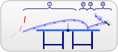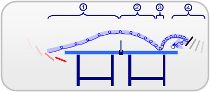 The topspin stroke has a smaller influence on the first part of the ball-curve. Like the backspin stroke, however, the axis of spin remains roughly perpendicular to the trajectory of the ball thus allowing for the Magnus effect to dictate the subsequent curvature. After the apex of the curve, the ball dips downwards as it approaches the opposing side, before bouncing. On the bounce, the topspin will accelerate the ball, much in the same way that a wheel which is already spinning would accelerate upon making contact with the ground. When the opponent attempts to return the ball, the topspin causes the ball to jump upwards and the opponent is forced to compensate for the topspin by adjusting the angle of his or her racket. This is known as "closing the racket".
